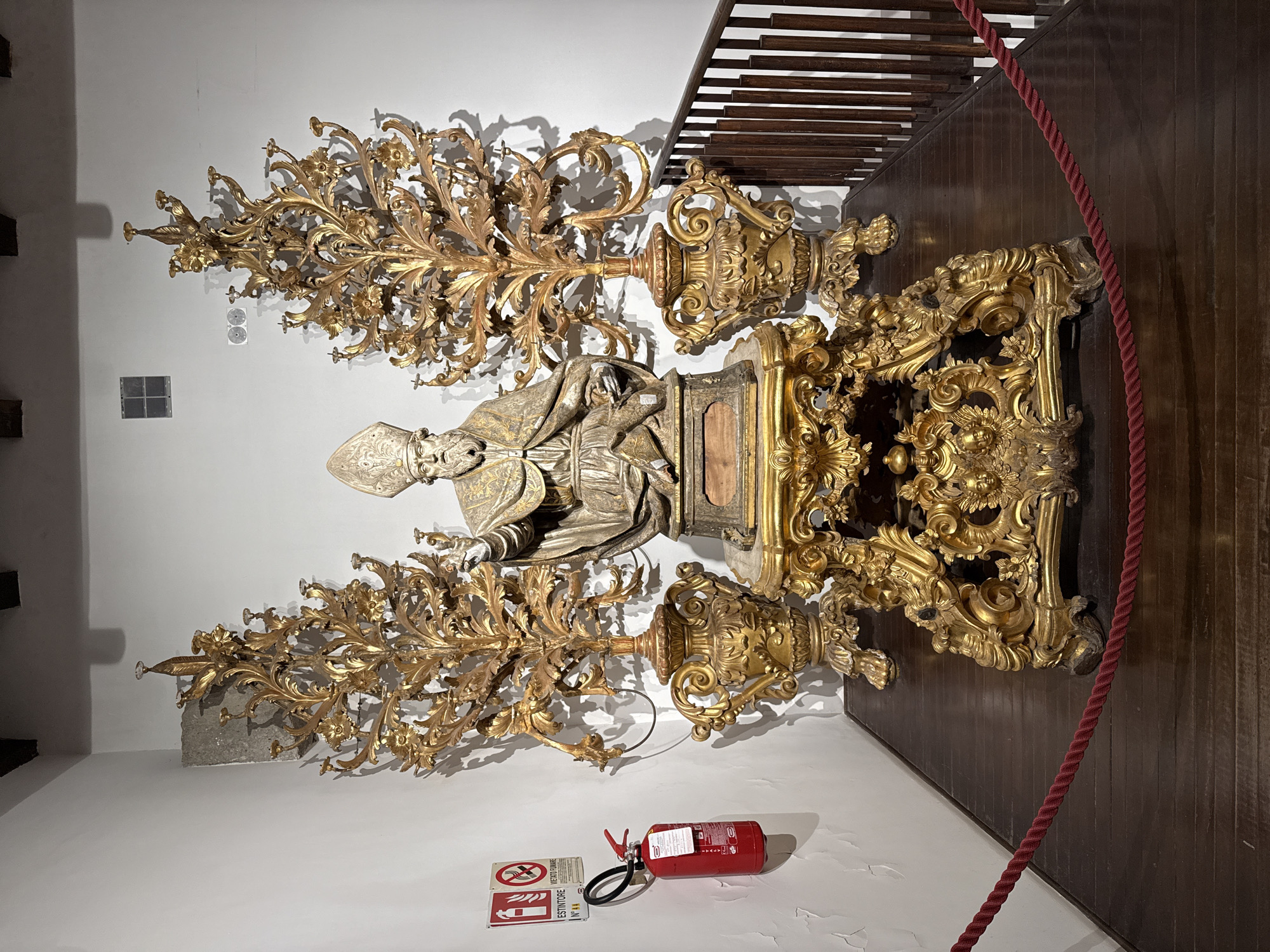 The image displays an ornate museum or sacred exhibit located within the Museo del Tesoro di San Gennaro, adjacent to the Naples Cathedral (Duomo di Napoli) in Naples, Italy. The central subject is a gilded wooden statue of San Gennaro, depicted seated, with a prominent beard, wearing a mitre and ecclesiastical robes. His right hand is raised in a gesture of blessing, while his left hand holds a book or scroll. The statue rests on a multi-tiered, intricately carved gilded wooden pedestal. This pedestal, in turn, is placed upon a larger, equally ornate gilded wooden table featuring scrolling legs and decorative elements including cherubic faces. The central statue is flanked by two large, highly elaborate, multi-branched gilded wooden candelabra, often referred to as "ex-voto trees," which feature numerous candle holders and intricate leaf and scrollwork designs. These objects are positioned on separate gilded pedestals on the same dark wooden platform as the central table. In the foreground, a taut, dark red velvet rope delineates the viewing area, running horizontally across a dark, polished wooden floor. To the immediate right of the display, a dark wooden railing with vertical balusters suggests a drop-off or a set of stairs. The background consists of plain white walls, exhibiting some textural imperfections and minor cracking. On the left wall, a red wall-mounted fire extinguisher, labeled "ESTINTORE N°4," is visible below two white-on-red warning signs: one depicting a fire extinguisher symbol and the other a "No Smoking" symbol ("VIETATO FUMARE"). Higher on the left wall, a small, square, gridded vent is present, along with a rectangular section of exposed stone or an unrendered wall segment near the ceiling. Dark wooden ceiling beams are partially visible at the very top of the frame. Overhead lighting casts distinct shadows of the main subjects onto the white wall behind them.