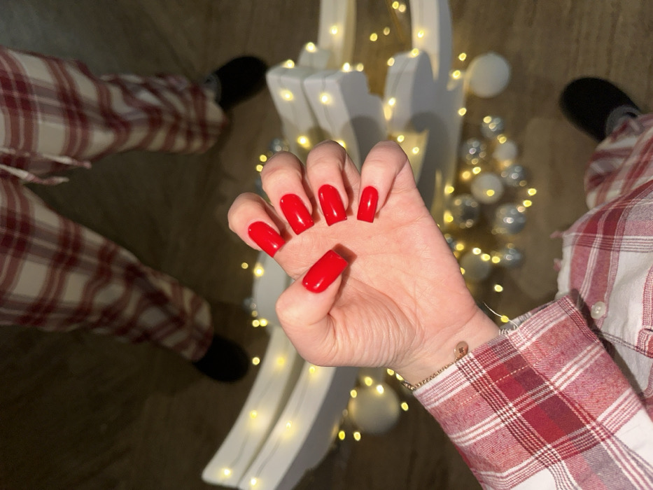 A hand with a fresh, glossy red manicure is centered. The nails are square-shaped. The person is wearing red and white plaid pajamas. The person is standing over a lighted white Christmas decoration with ornaments. The footwear is black slip-on shoes. The scene is warmly lit, suggesting an indoor holiday setting.