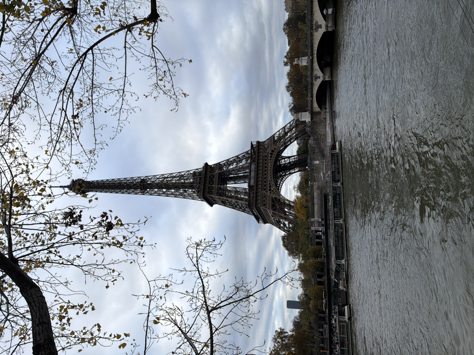 The image presents a daytime scene in Paris, France, featuring the Eiffel Tower from a vantage point across the Seine River. The Eiffel Tower, a dark brown iron lattice structure, dominates the upper central and right portions of the frame, extending towards an overcast, cloudy sky. In the foreground, the dark, rippled surface of the Seine River flows. Along the left bank, multiple elongated passenger boats, characterized by large windows, are docked side-by-side at a stone quay. The riverbank is lined with deciduous trees, largely bare, displaying scattered yellow and brown leaves, indicating an autumn or winter season. A slender, dark, high-rise building is visible in the distant background on the left. To the right, a multi-arch stone bridge spans the river. It features prominent light-colored balustrades and sculptural elements atop its piers. Tree branches with sparse foliage frame the upper periphery of the image, creating a natural border around the view of the Eiffel Tower and the Parisian urban landscape. The overall lighting is diffuse, consistent with an overcast sky. No individuals are clearly identifiable.