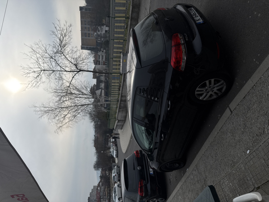 An urban street scene in Kardzhali, Bulgaria, is depicted under an overcast sky with a bright sun visible in the upper right. The perspective is from an elevated position overlooking a street. In the immediate foreground, to the left, a section of a grey patterned sidewalk is visible, along with a partial view of a white chair base and a dark green, grid-textured tabletop, suggesting an outdoor seating area. The main subject is a black Volkswagen Golf hatchback parked parallel to the street on the right. This vehicle features louvered window covers on its rear side windows and a visible Bulgarian license plate "K 6463 BM". The right rear wheel is a silver multi-spoke alloy, while the front left wheel, partially visible, appears to be a black steel rim. Ahead of this vehicle, a second black Volkswagen Golf hatchback is parked, displaying a "GOLF" badge and possibly an "R" badge or performance diffuser on its tailgate. Its license plate is partially obscured but begins with "K". The asphalt road curves to the left in the mid-ground. Approximately 3-5 indistinct human figures are visible walking on the far side of this curved road. A concrete retaining wall topped with a metal railing, featuring green horizontal bars and yellow vertical elements, runs along the curve. Beyond this railing, a body of water is present, with several light-colored cars parked on an adjacent bank or road. The background is dominated by bare deciduous trees, indicating a colder season (winter or early spring). Various multi-story buildings, including residential and commercial structures, line the horizon. A prominent, multi-story, light-colored building with a distinctive slanted upper section stands on the far right horizon.