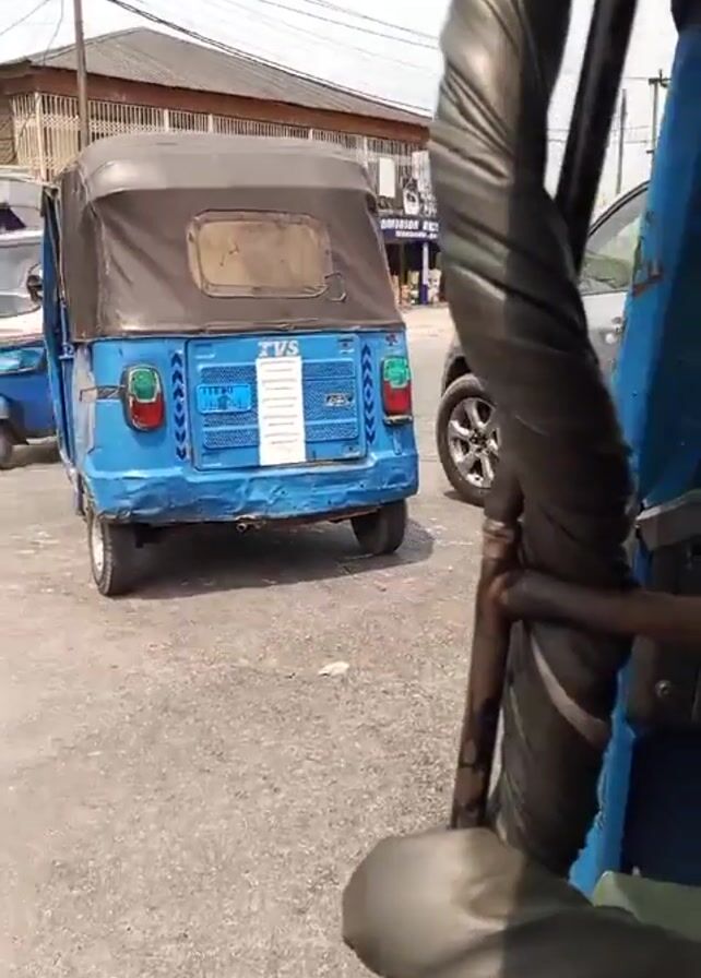 ride in a blue auto rickshaw on a paved road. Other rickshaws and vehicles can be seen driving in the same direction. Buildings and billboards line the sides of the road. A person walks on the sidewalk near a store. The sky is bright but hazy. The camera is positioned inside the rickshaw, focusing on the road ahead and the frame of the vehicle. The ride continues with a view of the road and surrounding buildings.