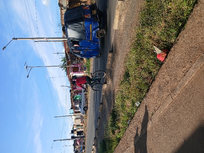The image depicts an outdoor street scene in Thika Township ward, Kenya, under a bright, clear sky with scattered white clouds. In the foreground, a rough-textured, reddish-brown paved sidewalk is visible on the left, separated by a concrete curb from a vegetated dirt verge. The verge contains green grass and scattered white plastic debris. A partially visible red and white object, possibly a discarded container, is embedded in the grass at the bottom right. The midground features a two-lane paved road, appearing worn, separated from the verge by additional concrete elements. A male individual, wearing a red long-sleeved shirt and dark trousers, rides a black bicycle from left to right, facing away from the camera. To the right of the cyclist, a blue three-wheeled vehicle, resembling a tuk-tuk or bajaj, with a black fabric canopy, travels in the same direction. It has yellow markings on its side. The background consists of a row of single-story, informal commercial structures or residences lining the left side of the street. These buildings exhibit varied facades, including painted surfaces (some pink), and corrugated iron roofs. Barbed wire or razor wire is visible atop some structures. A light-colored sedan is parked in front of these buildings on the left. Several utility poles with overhead power lines crisscross the upper portion of the frame. Two streetlights with solar panels are prominent, one taller and more centrally located than the other.
