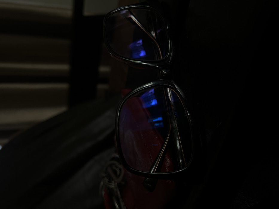 - "A pair of black-framed eyeglasses with blue-tinted reflections on their lenses rests on a dark, unidentifiable surface in the foreground" by FM-NXdI52, licensed under CC BY 4.0