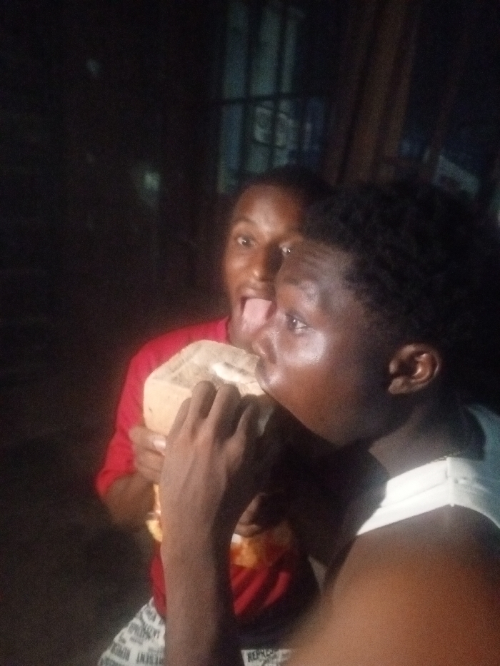 In a dimly lit setting, two young men are featured. One, wearing a red shirt, stands behind and slightly to the left, sticking his tongue out playfully with wide eyes. The other, in a white tank top, is closer to the camera and to the right, focused on a large, wrapped item he's holding and appearing to take a bite from it. The background reveals a window with bars. The overall lighting is poor, contributing to the grainy quality of the image.
