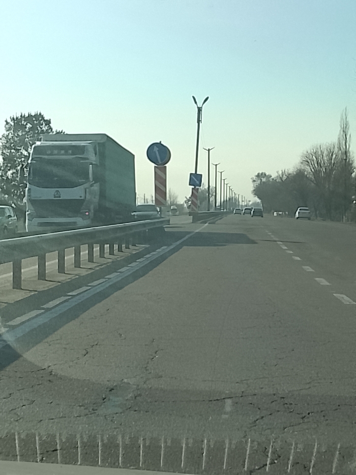 The image depicts a daytime view of a multi-lane asphalt road in Imeni Akhunbabayeva, Uzbekistan, from the perspective of a vehicle's interior. The asphalt in the immediate foreground exhibits numerous cracks. A metal guardrail separates the viewer's lane from an adjacent lane or median on the left. On the left side of the road, a large, white semi-truck with a green cargo trailer is prominent, facing towards the viewer or moving in the opposite direction. Characters in a non-Latin script are visible on the truck's cab. Beyond the guardrail and to the left of the truck, a portion of another light-colored vehicle is visible. In the middle ground, two traffic signs are mounted on distinct orange and white striped poles. The first is a circular blue sign with a white arrow pointing vertically upwards, indicating a mandatory straight direction. The second is a square blue sign with a white arrow pointing diagonally downwards to the right, possibly indicating a turn or deviation. A series of black streetlights with bifurcated luminaires line the road, extending into the distance on both sides. Several light-colored passenger vehicles are visible further down the road in the same direction of travel as the viewer. Trees with varying foliage are present along both sides of the roadway, some appearing bare, indicating a possible colder season. The sky is clear and light blue, with a slight atmospheric haze visible on the distant horizon. No individuals are visible in the frame.