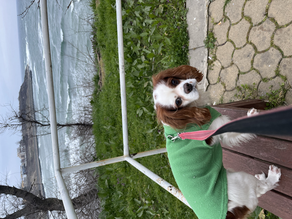 - "A Cavalier King Charles Spaniel, wearing a bright green fleece coat and a pink leash, stands on a dark brown wooden bench" by FM-XwS7W2, licensed under CC BY 4.0