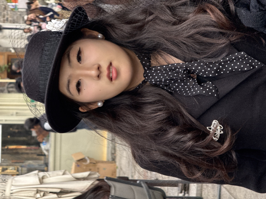 A young East Asian female is positioned centrally, facing directly towards the viewer with a neutral expression and slightly parted lips. She wears a black, wide-brimmed hat featuring a black mesh veil and a white floral embellishment on the right side. Her dark, wavy hair extends over her shoulders. She has pearl stud earrings in both ears, and her eyes are accentuated with dark eyeliner. Her attire includes a black coat, over which a black scarf with white polka dots is tied at the neck. A silver-toned, ornate brooch is pinned to the left lapel of her coat. The background depicts an urban street scene in daylight. To the left, a light-colored, folded canvas umbrella structure is visible, alongside a partially visible grey outdoor chair and a brown cardboard box. Further in the background, a light-colored building facade with indistinct features and a dark doorway is present. Other blurred figures, including one partially visible male in a white vest, are discernible in the middle ground, indicating a public area. Additional blurred figures are visible in the distance to the right, suggesting a moderate crowd. The scene is located in Qinhuai District, China.