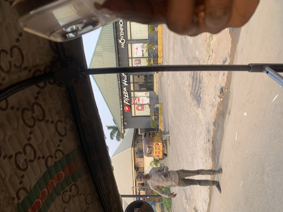 The image captures an outdoor daytime scene in the Jahi District of Abuja, Nigeria, specifically on Jahi-Katampe Road. The perspective is from inside a vehicle, indicated by a patterned, brown roof lining featuring a repeating "GG" (Gucci) logo and a prominent green and red stripe, along with a vertical black metal support bar. In the mid-ground, a male individual stands facing the viewer. He wears a light-colored plaid long-sleeve shirt, dark trousers, and dark slip-on shoes. He holds a white-cased smartphone in his right hand. The ground surface is a light grey, unpaved, or heavily worn asphalt area with visible dirt, gravel, and tire tracks. To the left and slightly behind the standing man, a tan and brown motorized tricycle (keke napep) is parked, facing away from the viewer. The background features a single-story commercial building with a dark grey facade and a prominent green sloped roof. The building houses two distinct businesses: "Pizza Hut" on the left, marked by its red logo and white text, and "MÖVENPICK" on the right, identified by its black logo and white text. Both establishments have glass entrances and windows displaying promotional signage. Dark outdoor tables and chairs are visible in front of the Mövenpick section. Small green plants are situated in planters near the building. Behind this commercial structure, another building with a light-colored roof and a tall palm tree are visible. The sky is clear and bright. In the immediate right foreground, a blurred human hand is visible, partially obstructing the view.
