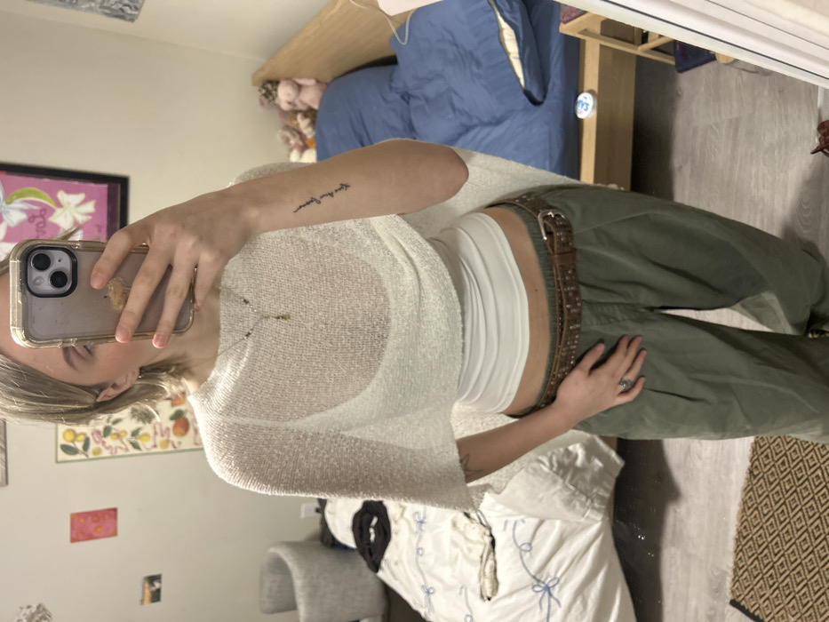 An image depicts a female subject taking a mirror selfie within a bedroom environment in Vancouver, Canada. The subject has short blonde hair and fair skin. Her right hand, equipped with a clear-cased smartphone and a light-colored pop socket, is raised, partially obscuring her face. Her left hand rests on her left thigh, bearing a ring on the ring finger. A linear text tattoo is visible on her inner left forearm. The subject is dressed in a sheer, white, textured poncho-style top layered over a white tank top, olive green pleated cargo pants, and a studded brown leather belt. A necklace featuring small green beads and a cylindrical green pendant adorns her neck. The bedroom features light-colored walls and a light-toned floor, partially covered by a brown patterned rug in the lower left. Two beds are visible: one on the left with a white duvet marked by blue curvilinear patterns, and another on the right with a light wooden frame and blue bedding. A gray upholstered chair stands near the left bed. Wall decor includes an abstract pink artwork, a vertical botanical print depicting citrus, and a framed pink floral design. Several stuffed animals are positioned on the headboard or side of the right bed. The image is a reflection, with the vertical edge of the mirror visible along the right side of the frame.
