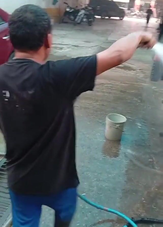 A person in a black t-shirt and blue pants is washing a red, three-wheeled motorcycle truck with a spray hose. The vehicle is lifted on a hydraulic lift in a garage. The floor is wet and the hose is blue. In the background, there are other vehicles and people.