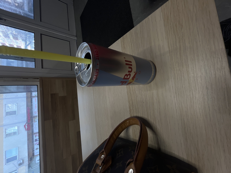 - "A Red Bull Zero Sugar can, silver and light blue, with an open pull-tab and a bright yellow plastic straw inserted, stands on a light wood-grain laminated tabletop" by FM-qlfhy1, licensed under CC BY 4.0