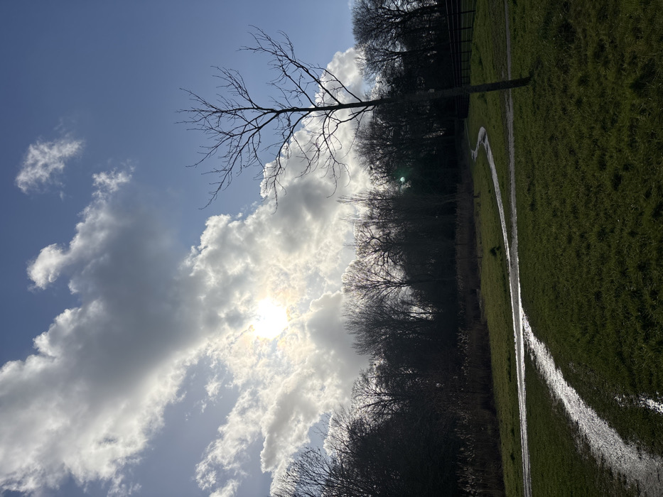 The image displays an outdoor park landscape, identified as Rengerspark in Leeuwarden, Netherlands. The scene is dominated by a partly cloudy blue sky, with a bright sun positioned behind and partially obscured by large white and grey cumulus clouds in the upper-left quadrant, generating significant glare and lens flare. The foreground consists of a green grassy field. Two unpaved paths, wet and reflective, intersect in the lower-middle, forming a 'Y' junction. One path originates from the lower-left and curves towards the center-right; the other branches off towards the upper-middle right. A single deciduous tree, bare of foliage, stands vertically in the mid-right. Its dark branches are silhouetted against the bright sky. In the background, a dense line of leafless deciduous trees forms a dark mass. Immediately in front of these distant trees, a strip of tall, dry reeds or grasses indicates a wetland or shallow water body. A dark, multi-rail fence extends horizontally along the right side of the frame. No people, animals, or other identifiable subjects are present in the depicted environment. The scene suggests a period of late autumn or winter, characterized by bare trees and evidence of recent precipitation.