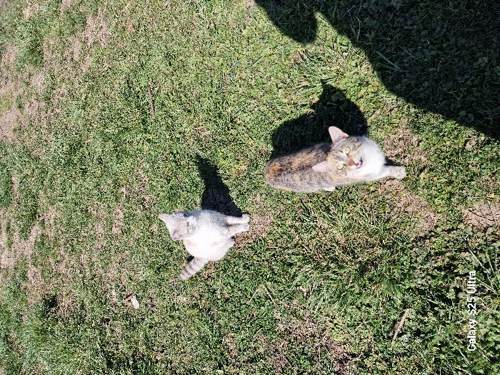 The scene is an outdoor, sunlit grassy area in Hadzhidimovo, Bulgaria. Two domestic cats are present on the patchy green and brown turf. In the foreground, positioned to the right of center, a tabby-patterned cat with brown, black, and orange markings, a white chest and muzzle, and green-yellow eyes stands, looking upward towards the camera with its mouth open. Behind and to the left of this cat, a lighter-colored cat, appearing primarily white or light grey with faint tabby markings on its tail and head, and blue-grey eyes, is seated, facing slightly right and forward. Strong shadows are cast on the ground from the cats and an unseen object or person (presumably the photographer) extending from the right side of the frame into the lower right corner. The text "Galaxy S23 Ultra" is visible in the lower left corner.