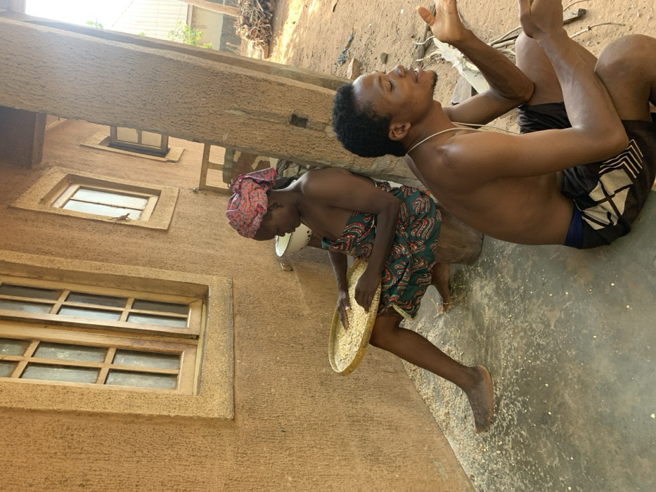 In Akwanga, Nigeria, two individuals are present outdoors in front of an ochre-colored, textured building wall with two wooden-framed windows. An adult female, with dark skin, wears a reddish patterned headwrap and a green and red patterned wrapper, exposing her shoulders and upper chest. She sits barefoot on a cut wooden log, actively winnowing or sorting light-colored grains within a circular, flat woven tray held on her lap. Her hands are positioned over the grains. To her right, an adult male, also with dark skin, sits barefoot on the ground. He is shirtless, wearing dark shorts with a white geometric pattern, and has a thin white cord necklace. He gestures with his open right hand, looking towards the right side of the frame, appearing to be in conversation or contemplation. The ground beneath the individuals consists of a concrete slab near the building, transitioning to bare dirt further out. Light-colored grain particles are scattered across the concrete. A white enamel bowl rests on the ground behind the female. In the distant background, a pile of cut firewood is visible under bright daylight.