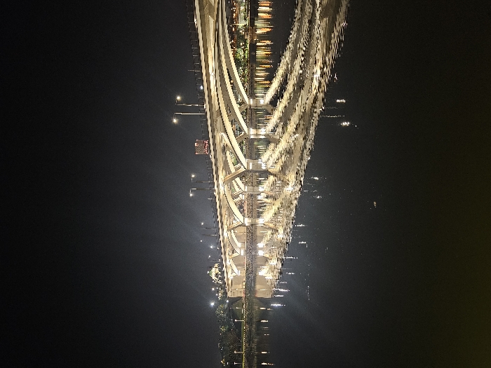 This is a nighttime vertical photograph depicting the Hassan II Bridge spanning the Bou Regreg River, connecting the cities of Salé and Rabat in Morocco. The perspective appears to be from the Salé riverbank, looking across towards Rabat. The scene is dominated by the illuminated bridge and its reflection in the dark water. The Hassan II Bridge is a modern concrete structure featuring multiple distinct segmental arches. The undersides of these arches are brightly lit with a warm, golden-white light, which is strongly reflected in the river below, creating shimmering vertical streaks and patterns on the water's surface. Numerous white-emitting streetlights line the upper deck of the bridge. A single vehicle, possibly a truck, is faintly visible traversing the bridge deck near the center-right. The Bou Regreg River occupies the lower half of the frame, appearing dark and largely still, though some subtle ripples are visible, particularly within the light reflections. On the far bank, beyond the bridge, various illuminated structures of Rabat are visible against the dark, clear night sky. To the left of the bridge, a prominent, dome-topped building, likely part of a landmark complex such as the Mausoleum of Mohammed V, is brightly illuminated. To the right, a tall, rectangular building with distinctive red-orange lighting near its upper levels stands out. Scattered lights from other distant city buildings are also visible along the horizon. No people or specific discernible actions are present in the immediate foreground or on the river.