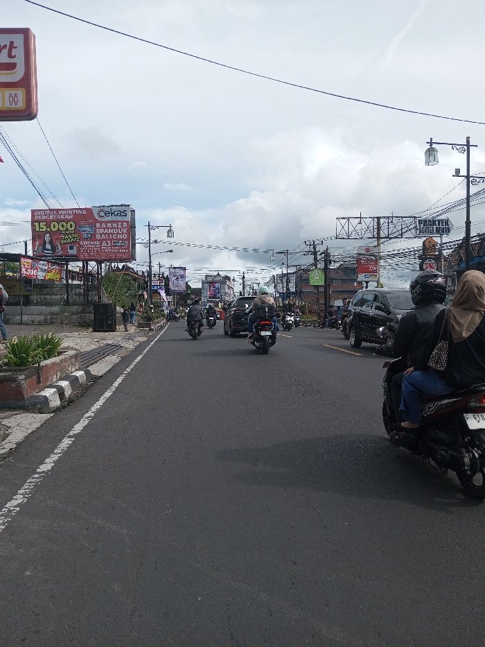 The image depicts a daytime street scene in Saing Ta Mawt Lay, Myanmar, under an overcast sky. The primary focus is a paved road extending into the distance, bordered by buildings and commercial signage. In the immediate foreground on the right, the rear of a dark-colored scooter is visible, occupied by a driver in a black jacket and helmet, and a passenger wearing a light brown hijab, black jacket, and blue jeans. The scooter's license plate, partially obscured, begins with "F 6183". To the left, a concrete median with white and black striped curbing contains green foliage. The midground features moderate traffic consisting predominantly of motorcycles and scooters, most traveling away from the viewer. A dark-colored car is also present. Several individuals are observed riding the motorcycles, wearing helmets and dark clothing. On the left side of the road, a raised concrete area with railings leads to commercial establishments. A prominent red billboard on the left advertises "DIGITAL PRINTING PERCETAKAN" and "Cekas", displaying details about "BANNER SPANDUK BALICHO" and pricing. Further down the street, additional billboards and signs are visible, including one for "PRAKTEK DOKTER UMUM" and another indicating a "BANK ATM". The environment includes numerous utility poles with dense networks of overhead wires crisscrossing the sky. Streetlights with ornate, possibly decorative, lanterns are mounted on some poles. Buildings lining both sides of the street exhibit various architectural styles, suggesting a commercial district. The sky is largely covered with heavy, grey clouds.