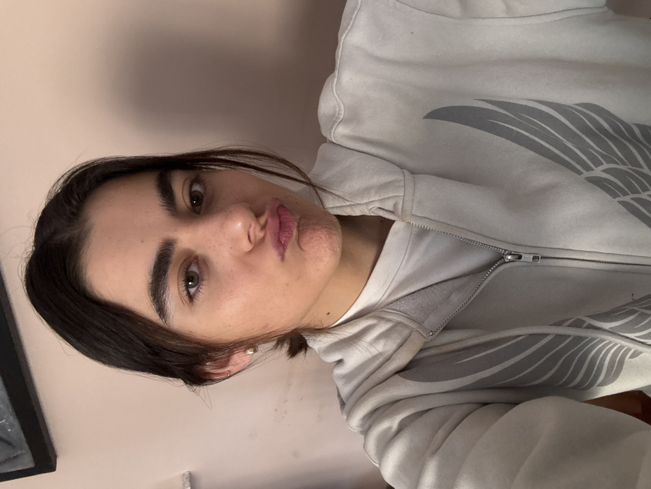 A young female, characterized by dark brown hair, prominent eyebrows, and brown eyes, poses for a selfie against a plain light-pink interior wall