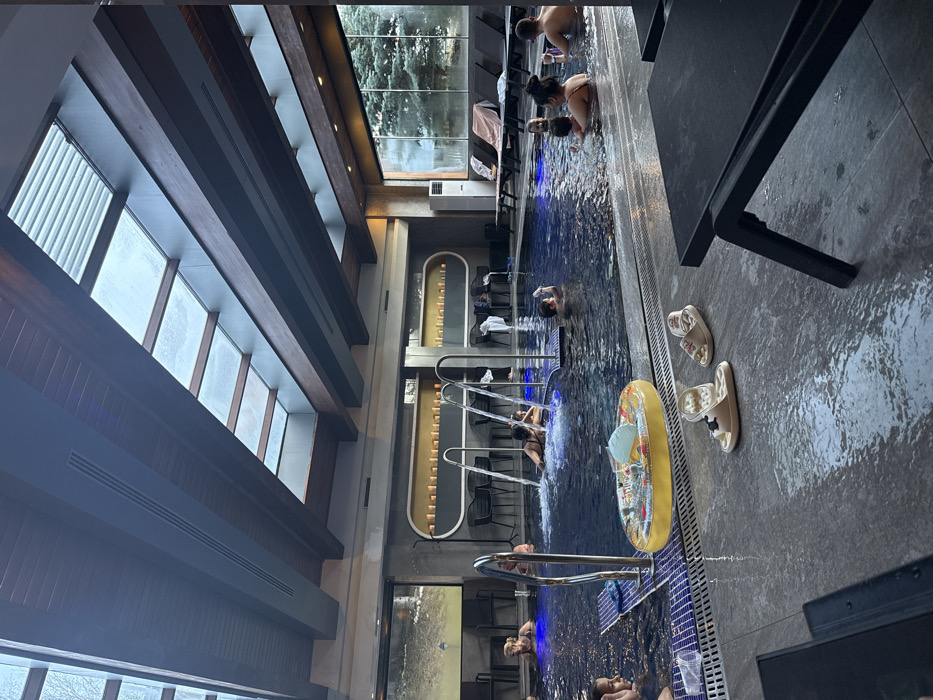 The image depicts an indoor swimming pool facility located in Bansko, Bulgaria. The environment is a spa or hotel pool area, characterized by a dark blue tiled pool with multiple individuals present. The ceiling features a series of dark wooden beams supporting frosted or partially obscured skylights, allowing natural light to enter. The walls are a dark grey, with a notable feature on the left side consisting of a recessed shelf displaying numerous illuminated candles or decorative lights. A large, floor-to-ceiling window on the right wall provides a view of an outdoor scene dominated by tall evergreen trees. Approximately 12-15 people are visible within the pool, engaged in leisure activities. Both adults and children are present, mostly partially submerged in the water. Two metal structures within the pool are actively generating water jets, creating localized splashing. A yellow inflatable ring, featuring a blue and white object (possibly a duck or small boat), floats near the pool's edge in the foreground. Adjacent to the pool on the wet, dark-tiled floor, two pairs of light-colored open-toe sandals are placed. Further right, a black lounge chair is partially visible in the immediate foreground, and additional black lounge chairs are arranged near the large window. A white, vertical air conditioning or ventilation unit stands against the wall to the right of the pool. Blue underwater lighting is visible in certain sections of the pool.