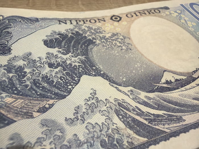 A close-up, angled photograph captures the reverse side of a Japanese 1000 yen banknote