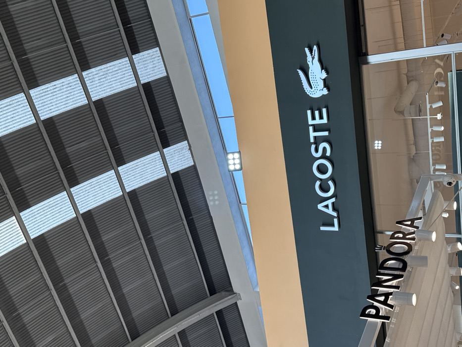 The photo captures the exterior of a shopping center. Visible store signs include Lacoste, recognizable by its crocodile logo, and Pandora. The architecture features a corrugated metal roof structure, with natural light filtering through the gaps. Overhead lighting is also present. The perspective is from below, looking upwards, emphasizing the vertical signage and the building's structural elements.