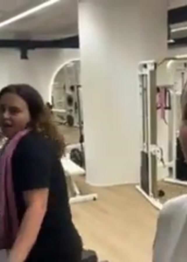 two women in a well-lit gym. The woman in the foreground is filming herself with a phone camera, smiling and looking directly at the camera. She is wearing a white t-shirt and has her hair pulled back. Behind her and to the left, the other woman is on a treadmill, walking and talking enthusiastically. She has a pink towel around her neck and is wearing a black t-shirt and leggings. A third woman is faintly visible in the background near a weight machine. The gym has white walls, mirrored sections, and various exercise machines. A pink water bottle is visible on the treadmill. Loud music is playing.
