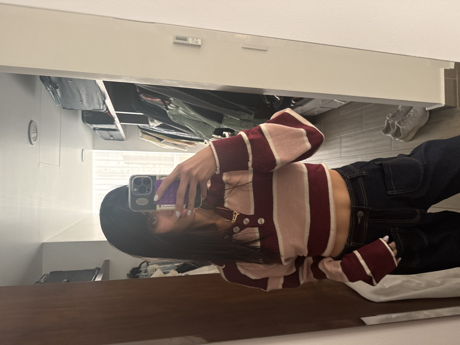 A young woman is taking a selfie in a mirror. She's wearing a striped, cropped cardigan with burgundy and light pink stripes, paired with dark wash, wide-leg jeans. Her black hair is long and straight. Her phone, with a purple textured case, partially obscures her face. A closet with hanging clothes and shelves is visible behind her, along with a pair of white sneakers on the floor.