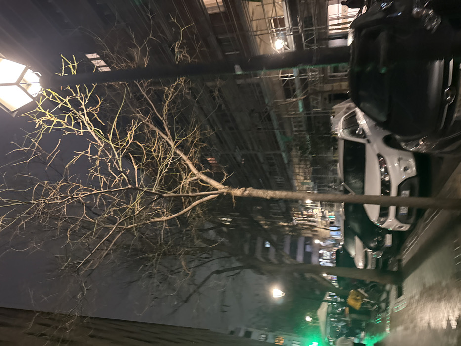 A nighttime street scene features bare tree branches silhouetted against a dark sky, illuminated by a street lamp. Buildings with scaffolding line the street, where several parked cars are visible. The image is slightly angled, creating a skewed perspective. The scene appears to be in an urban environment during the colder months.