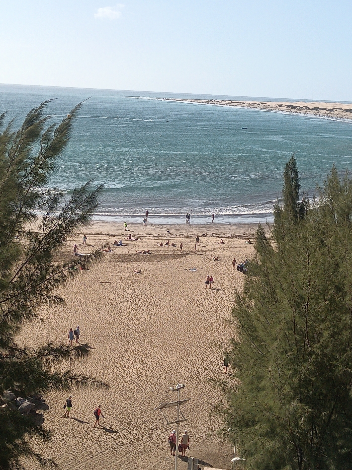 An elevated, high-angle view captures a sunny beach and ocean scene in San Bartolomé de Tirajana, Spain. The foreground is partially obscured by dense, dark green coniferous tree branches on both the left and right sides. The midground features a wide expanse of light brown sand, textured by numerous footprints. Approximately 30-40 individuals are visible on the beach. Some are walking in pairs or singly across the sand, while others are sunbathing, lying prone or supine on towels or directly on the sand. A few people are standing or wading in the shallow, foamy blue-green water at the shoreline, where gentle waves are breaking. In the lower right quadrant of the sandy area, a single street light pole with multiple lamellar arms is visible. The background consists of a vast expanse of blue-green ocean water, showing ripples and two small white wakes from distant watercraft, along with one small, dark boat. A low-lying, elongated landmass with distinct sand dunes and sparse vegetation extends along the far right horizon. The sky above is clear and light blue, with a single, faint white cloud visible near the top center.