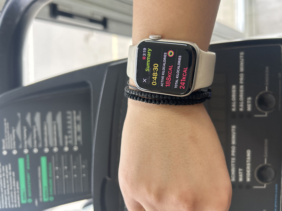 The scene is located in Xylotymbou, Cyprus. The image presents a close-up, angled view of a person's left forearm and wrist. A light-colored Apple Watch, featuring a silver Digital Crown on its right side and a matching light-colored sport band, is prominently displayed on the wrist. The watch face shows a "Summary" screen with "Total Time 0:48:30", "Active Kilocalories 188KCAL", and "Total Kilocalories 241KCAL". A time of "3:19" is visible in the top right corner of the watch display. Two black braided bracelets are worn on the wrist, positioned closer to the hand than the watch. The upper portion of a hand, with visible skin texture, is partially shown on the left side of the frame. The background, out of focus, reveals the dark gray control panel of a piece of exercise equipment, likely a treadmill or elliptical machine. Visible text labels on the console include German terms such as "SCHRITTE PRO MINUTE" (steps per minute), "WATT", "WIDERSTAND" (resistance), "KALORIEN" (calories), "KALORIEN PRO MINUTE" (calories per minute), and "METS". Several green illuminated bars indicate active selections or quick start options on the equipment's display. The environment suggests an indoor setting, consistent with a gym or home fitness area.