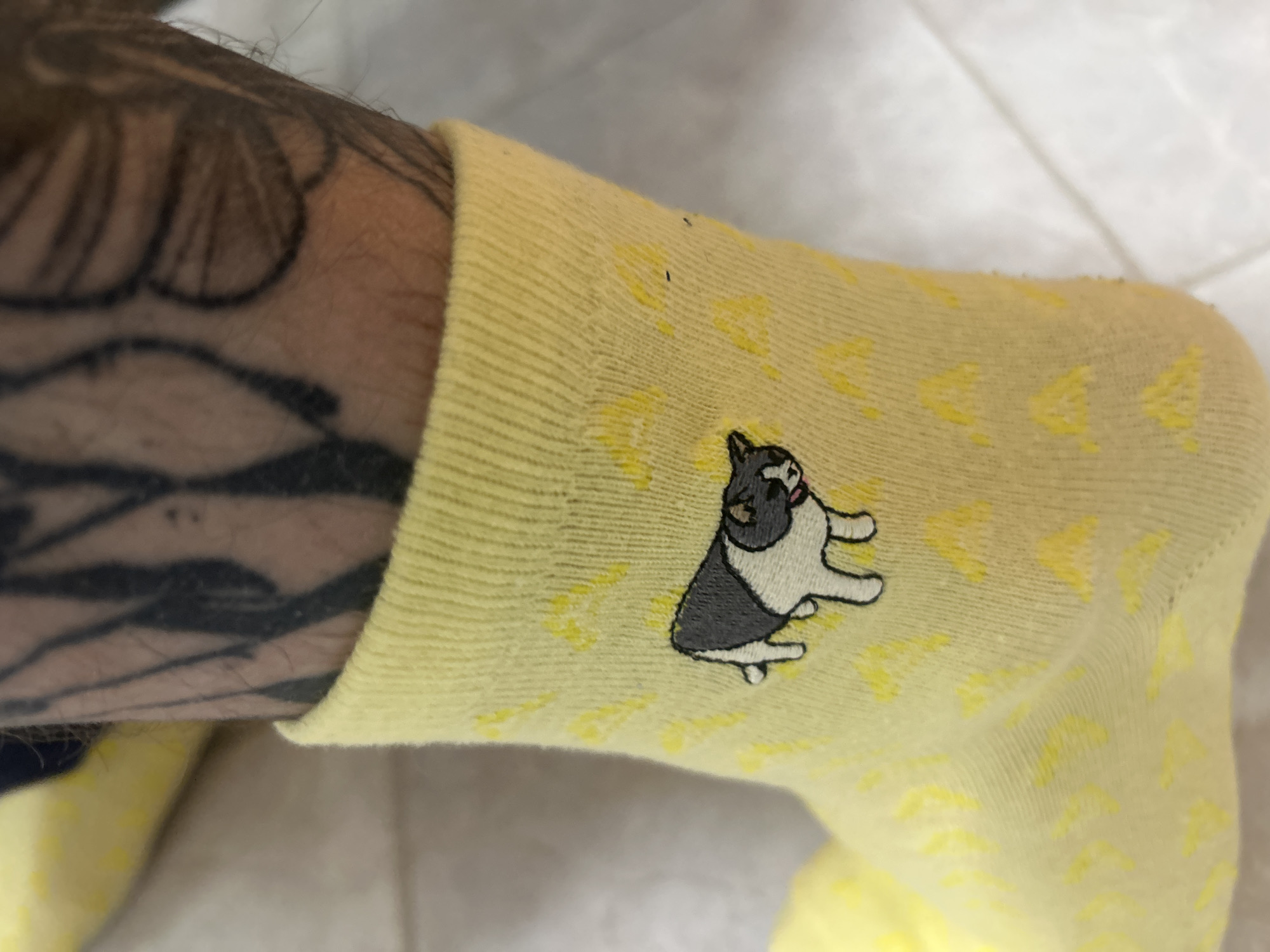 person's ankle and lower leg wearing a yellow sock with an embroidered gray and white dog. The leg has a large tattoo featuring black ink designs. The background is a pale, neutral tone, likely a floor or wall. The location is unspecified.