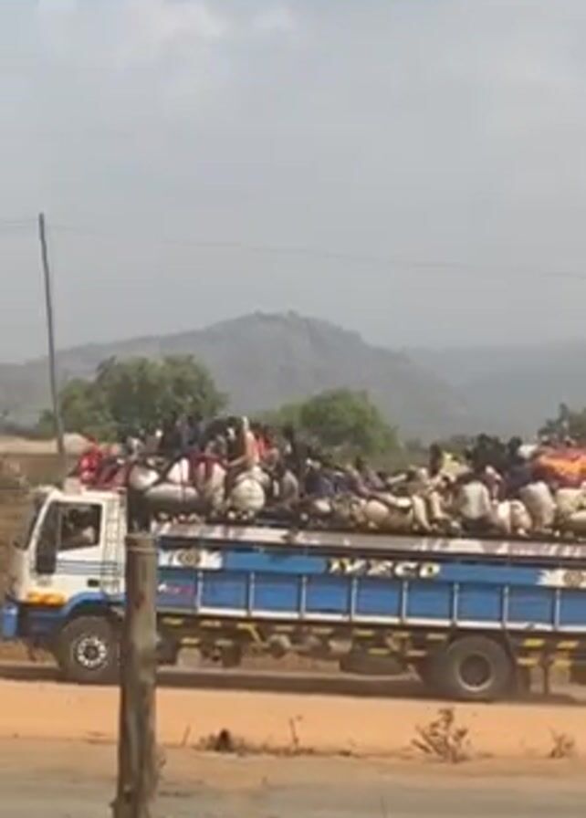 blue and white IVECO truck driving along a paved road on a sunny day. The back of the truck is heavily loaded with people and what appear to be large sacks. There are numerous people sitting on top of the sacks in the truck bed. The background shows a landscape with trees and distant mountains. A person walks by the road near the truck. The truck kicks up dust as it drives away.