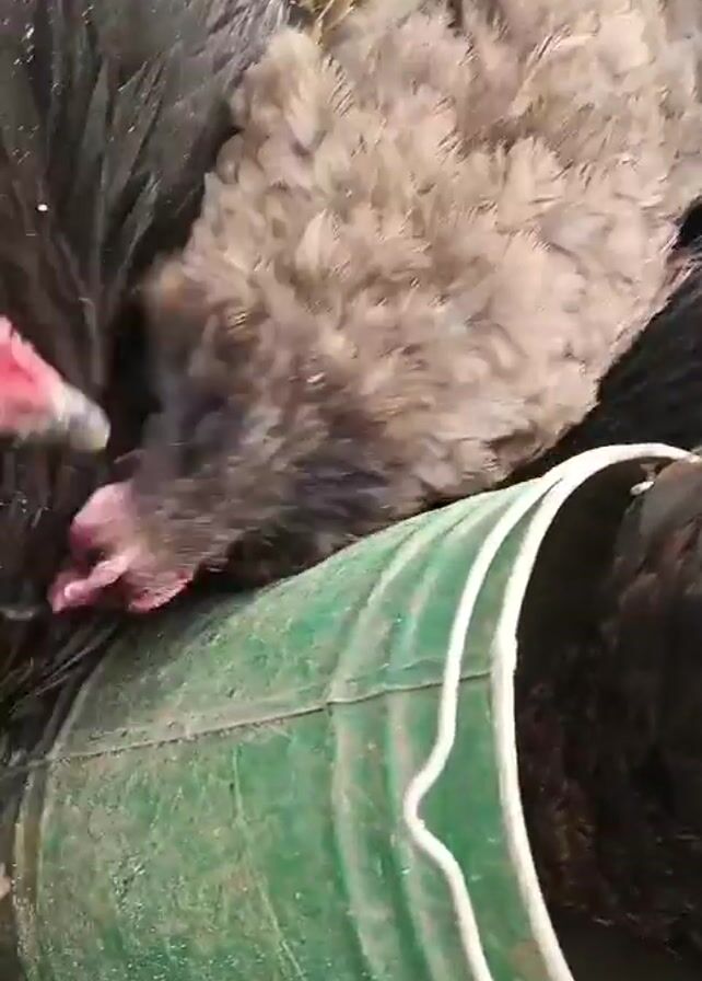 A close-up shot shows a flock of chickens huddled tightly together near a green object