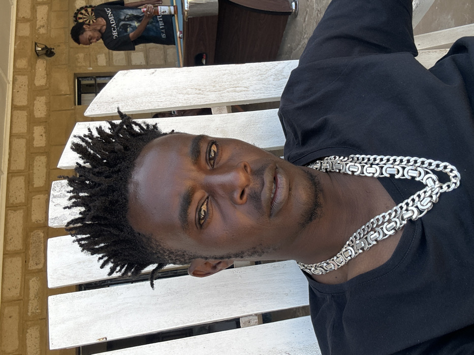 The image depicts an outdoor or semi-outdoor recreational area in Olkaria ward, Kenya, illuminated by bright daylight. In the foreground, a male individual with dark skin, short, upward-styled dark dreadlocks or twists, and minimal facial stubble is seated in a white, slatted wooden chair. He wears a black short-sleeved t-shirt and two distinct silver-colored chains around his neck, one appearing as a Byzantine-style link and the other a Cuban link-style. His light brown eyes are directed towards the viewer. In the mid-ground, a second male individual with dark skin and short dark hair stands partially obscured by the foreground chair's slats. He is positioned in front of a light-colored brick wall and wears a dark t-shirt with white text, visibly displaying "DECADENCE" and "IS A VIRTU...". He holds a beverage bottle, consistent with a beer bottle, in his right hand. Directly in front of this individual is a blue-felted pool table. A dartboard is mounted on the brick wall to the right of the standing person, and a wall-mounted light fixture is visible above it. The ground surface is a light-colored paved area.