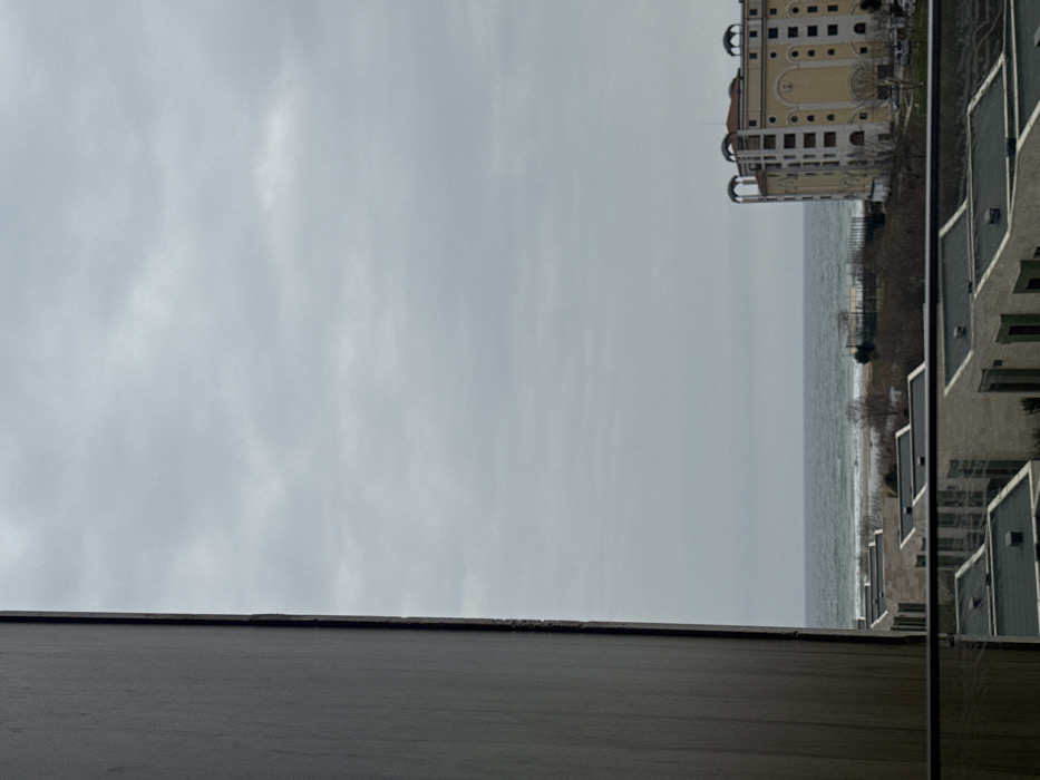 A cloudy sky dominates the frame, contrasting with a dark, flat surface in the foreground. To the right, buildings align vertically, with balconies and windows visible. Further away, the sea meets a strip of beach, with additional buildings, one notably beige and ornate, in the distance. The perspective creates a slightly disorienting effect.
