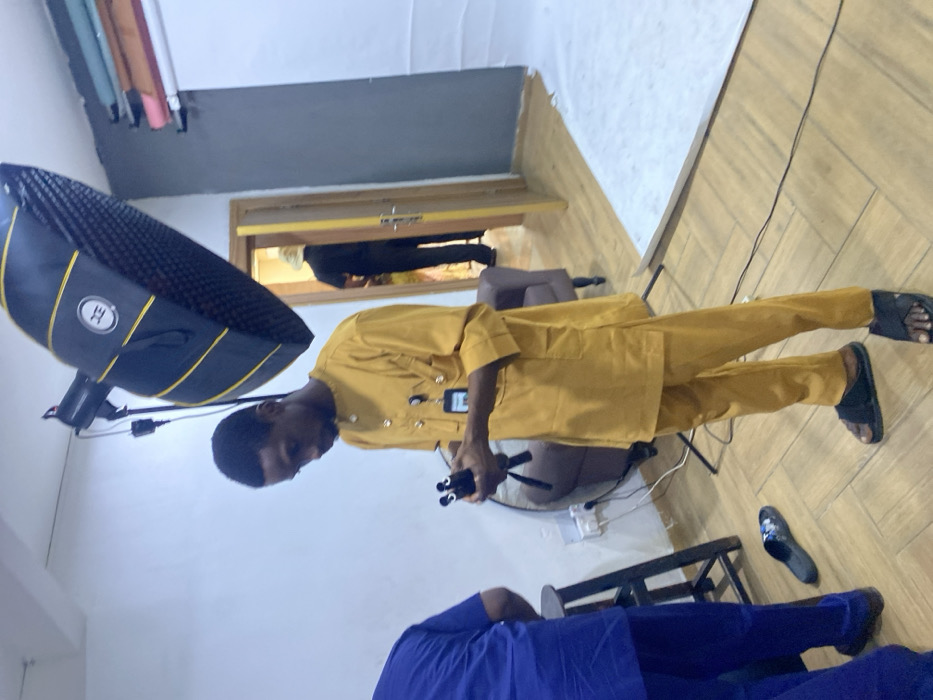 A man in a mustard-colored suit stands in a photo studio. He holds a small tripod. A softbox is nearby, along with various studio equipment. Another person, dressed in blue, is partially visible in the foreground. The studio has a wooden floor and white walls, with rolls of background paper visible in the upper left corner. There is also a doorway or archway in the background.