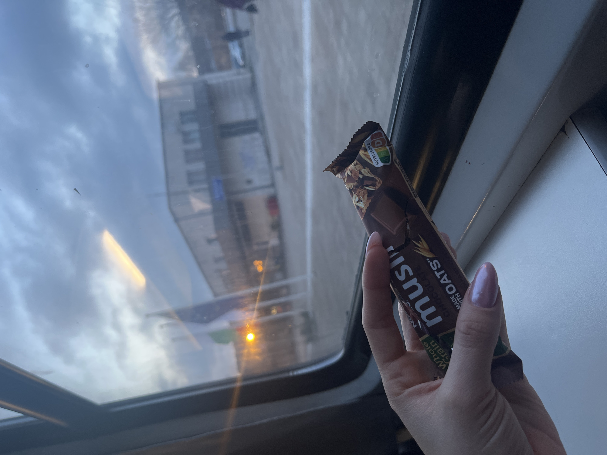The image depicts an indoor perspective looking out a window, likely from a train or bus, with a human hand in the foreground. The hand, exhibiting manicured nails with light pink polish, holds a partially consumed "musi" branded chocolate muesli bar, displaying "Whole Grain," "Made with OATS," and a "NUTRI-SCORE B" label. Through the window, an exterior scene in Beloslav, Bulgaria, is visible under a cloudy sky during what appears to be dusk or dawn. A prominent two-story, light-colored building with multiple windows is situated in the midground. In front of this building, at least two flags are mounted on poles; one is clearly identifiable as the Bulgarian flag (white, green, red vertical stripes), and another, partially obscured, is visible. Artificial light sources, possibly streetlights or interior lights from buildings, create distinct orange-yellow glows and reflections, one particularly bright on the horizon. The ground outside appears to be a paved area, possibly a station platform or a street, with some lighter markings. Blurred human figures are discernable in the distant background, suggesting pedestrian activity.
