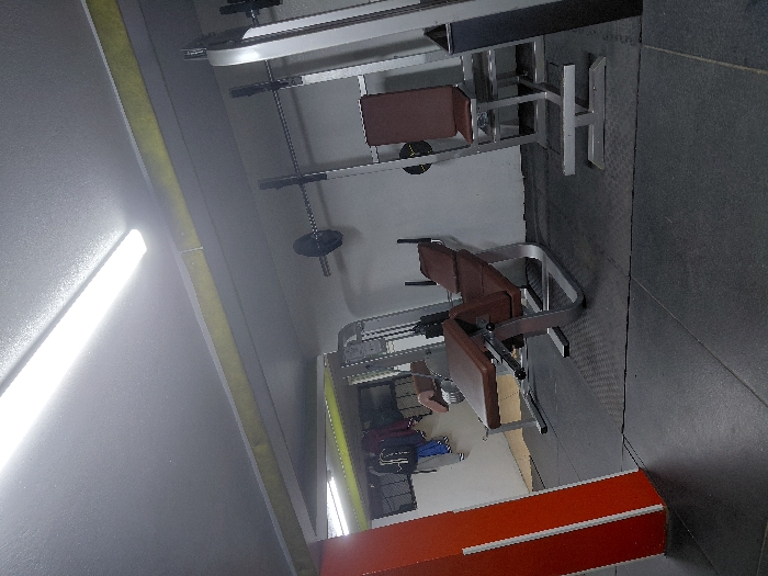 A gym setting reveals various pieces of exercise equipment. Primarily, two machines with brown padding and silver frames dominate the view, positioned near a grey tiled floor. A weight hangs from a chain above. The walls are painted grey, accented by a yellow strip. An orange and red baseboard adds color. Other gym equipment can be seen distantly.
