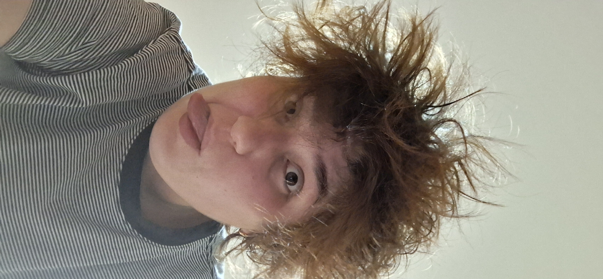 A person with light skin, brown hair, and brown eyes looks down into the camera. The person is wearing a striped shirt with gray and white stripes, and their tongue is slightly protruding from their mouth. The location is unknown, so the description cannot include any details about Chaikovsky, Russia. The background is a plain white wall.