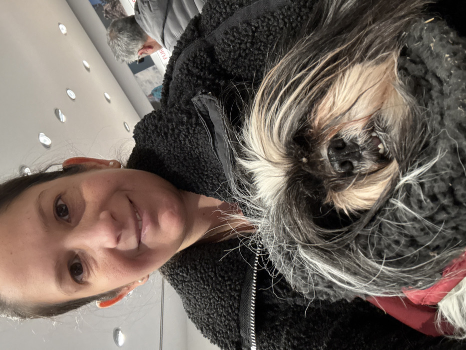 A woman smiles into the camera, positioned on the left side of the frame. She has brown hair and eyes. To her right is a small dog, nestled in her jacket. The dog's fur is a mix of black, white, and gray, obscuring most of its face except for its nose and whiskers. The woman is wearing a black, fuzzy jacket with a zipper. The background consists of a white wall with recessed lighting. A man is visible further back, near a wall display.