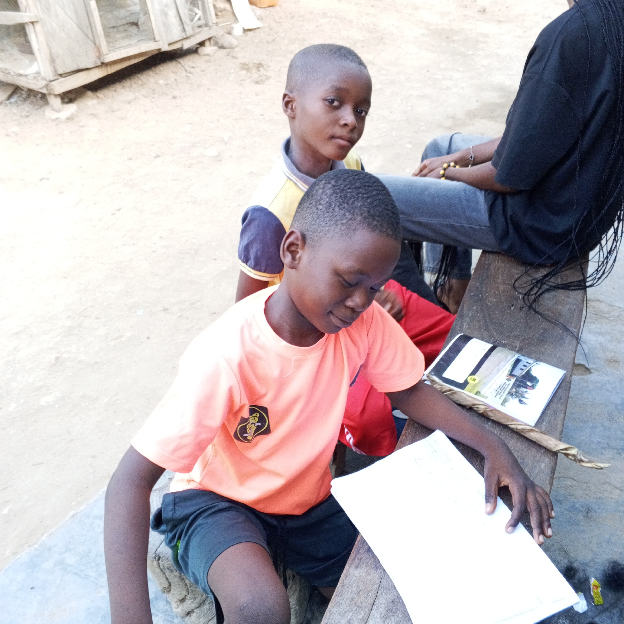 The image depicts a daytime scene in Adankolo, Nigeria, featuring three individuals seated on a weathered wooden bench. In the foreground, a young boy with short dark hair, wearing an orange short-sleeved t-shirt with a dark emblem on the left chest and dark shorts, is leaning forward, looking down at a blank white sheet of paper on the bench. His left hand rests on the paper. Behind him, a second young boy with short dark hair, dressed in a yellow and dark blue collared short-sleeved shirt, looks directly at the viewer with a neutral expression. To the left of the second boy, an individual with dark skin, wearing a black oversized t-shirt and blue jeans, is partially visible from the back. Long dark braids extend down their back, and their clasped hands, adorned with a gold-beaded bracelet and a silver-colored bracelet, rest in their lap. On the wooden bench, adjacent to the paper, a closed book with a photographic cover and a long, spirally wrapped brown object are present. The ground is unpaved, light-colored, and dusty. In the background, a raised wooden structure, supported by concrete blocks, is partially visible.