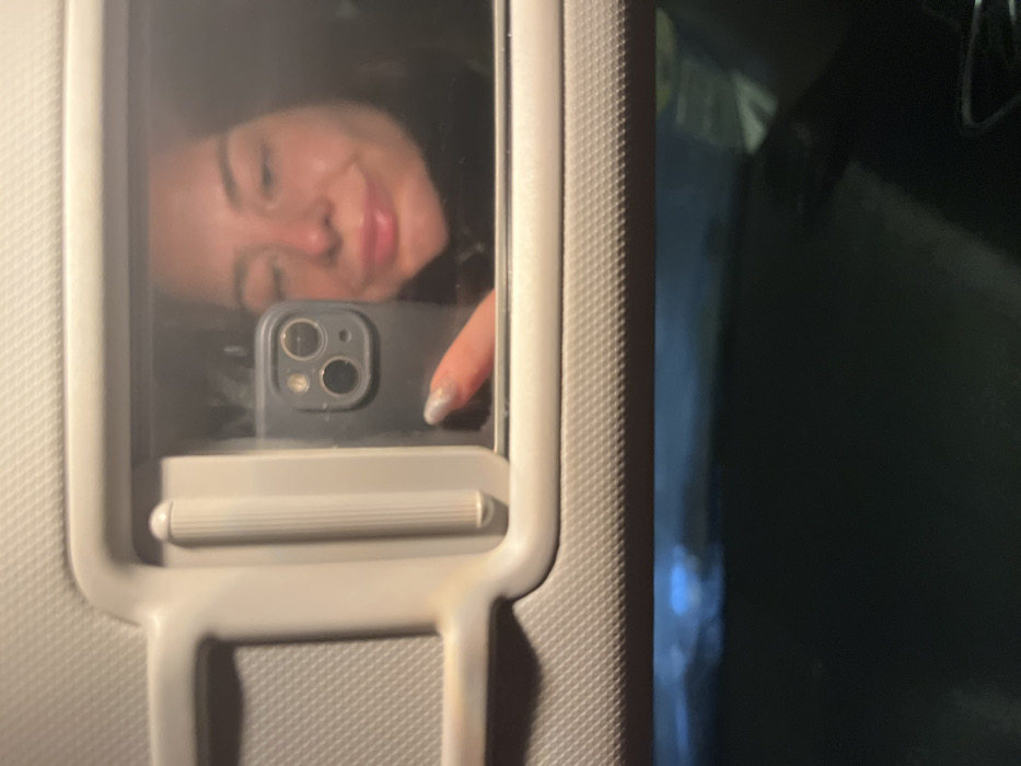 A woman takes a selfie in the mirror of a car visor. Her face is close to the mirror, and she is smiling slightly. The phone, a dark-colored iPhone, is visible in the foreground. The mirror is surrounded by a textured gray frame. Outside the car window, it is dark, but a hint of blue light can be seen.