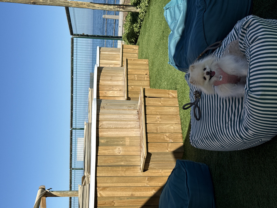 The image displays an outdoor leisure area in a coastal part of Cape Town, South Africa, overlooking the Atlantic Ocean under a clear blue sky. In the foreground, a white Pomeranian dog wearing a pink harness sits facing forward on a green and white striped beanbag. A dark leash is coiled on the beanbag beside the dog. Partially visible to the left and right are additional teal-blue beanbags. The ground surface consists of artificial green turf. In the mid-ground, three cylindrical structures constructed from vertical wooden planks stand in a staggered arrangement. Each structure features a light-colored top rim; the two closest structures include a small, integrated wooden shelf. Behind these wooden structures, a green metal mesh fence with anti-climb spikes runs horizontally, separating the area from the expansive, deep blue ocean visible in the background. A wooden pole supporting a light-colored fabric canopy is present on the far left, and another wooden fence post is on the far right. Small green shrubs are visible near the fence line.
