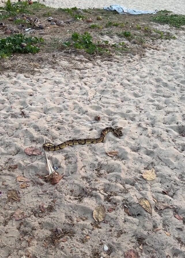 snake in a defensive posture on a sandy beach. The snake is a ball python, patterned with dark brown and tan markings. It is curled with its head raised. The sand is light-colored and scattered with leaves and debris. In the background, there are people on the beach. They are standing and walking along the shoreline. There is some vegetation and litter near the edge of the beach where the sand meets the land. The lighting suggests it is daytime.