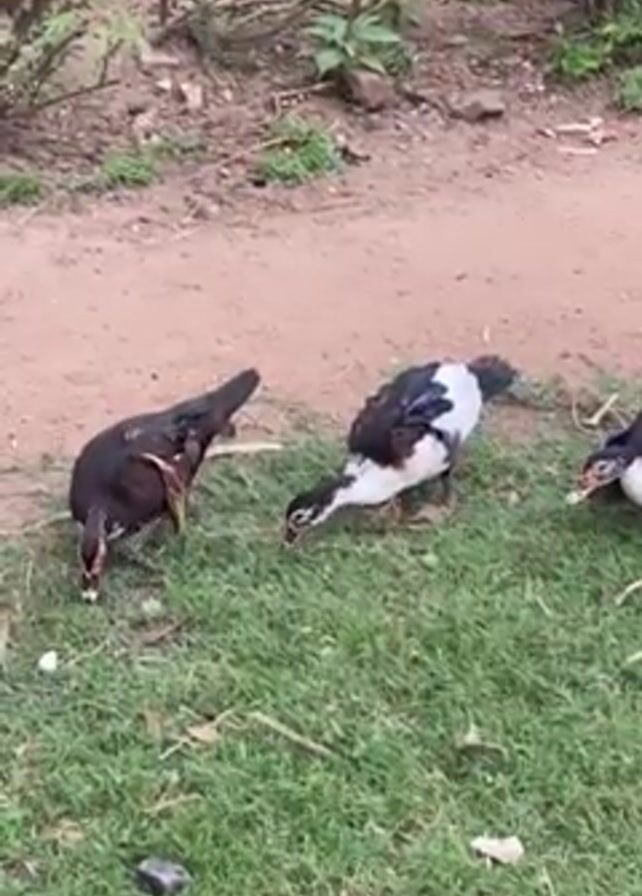 - "three Muscovy ducks eating grass in a yard with a patch of dirt in the background" by FM-6XMFv1, licensed under CC BY 4.0