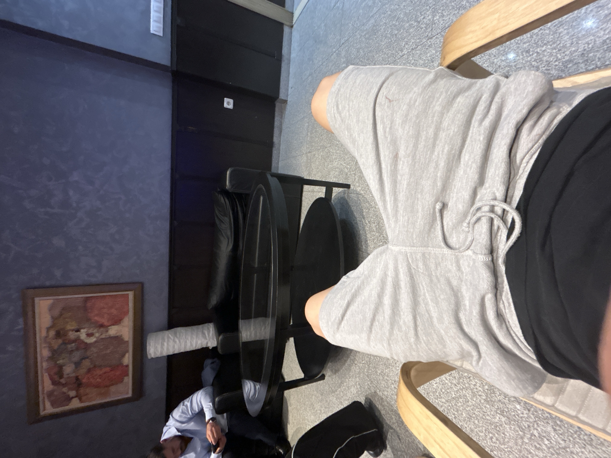 The scene depicts an indoor waiting area or lounge, located in Dedovo, Bulgaria, captured from a seated, first-person perspective. In the immediate foreground, the photographer's legs are visible, dressed in light grey athletic shorts with a white drawstring tie, worn over a black undergarment. The right armrest of a light wooden chair is partially visible. In the midground, a dark, two-tiered circular coffee table with a reflective top surface stands. To the left of the table, a male individual is seated on a dark upholstered chair, wearing a light blue long-sleeved button-down shirt and dark trousers. He is observed looking down at and operating a smartphone held in his left hand. A dark jacket is draped over the arm of his seat. To the right of the table, a section of dark leather seating, possibly an armchair or sofa, is visible. A tall, white, cylindrical decorative object is positioned between the seated man and the dark leather seating. The background consists of a dark blue wall with a subtle textured pattern. A framed painting, featuring an abstract or impressionistic composition with warm earthy tones, reds, and greens, hangs on this wall. Below the textured wall section, a darker, possibly black, wainscoting or lower wall panel is visible, with a white electrical outlet mounted on it to the right. The floor is composed of light grey speckled tiles. A vertical light-colored architectural element, potentially a doorframe or panel, is visible on the far right edge of the frame.