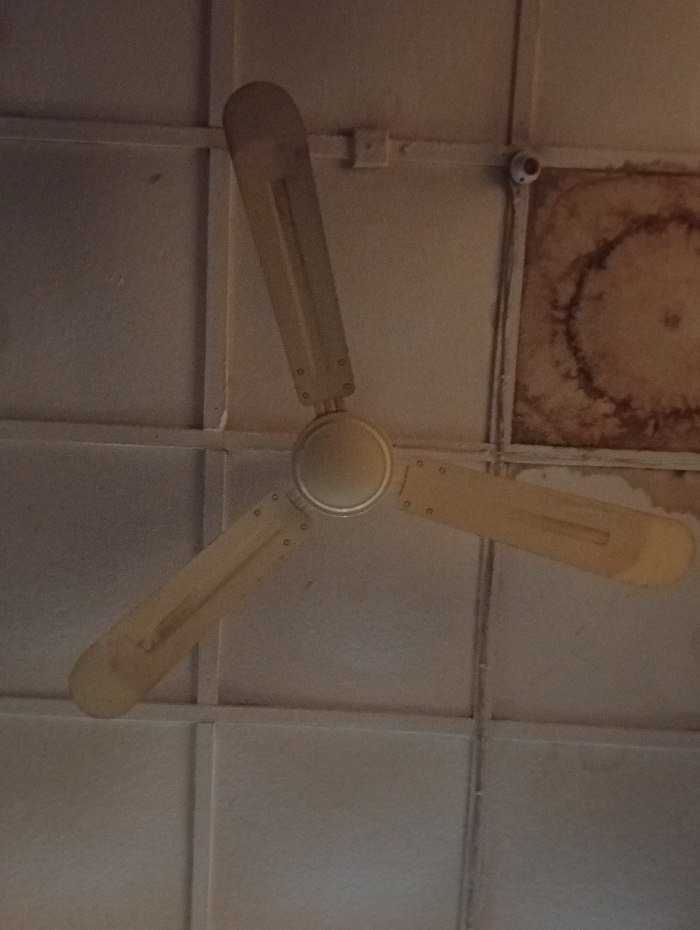 An overhead view reveals an interior ceiling in the City of Unknown, Unknown. A three-bladed ceiling fan, off-white to light beige, is centrally mounted, its blades exhibiting discoloration and dust. The ceiling comprises light-colored rectangular panels separated by linear structural elements. Electrical conduit runs across the ceiling, connected to a small, white, square junction box and a compact, white, dome-shaped security camera located in the upper right quadrant of the image. A prominent, dark brown, multi-ringed water stain or mold growth covers a significant portion of a ceiling panel in the upper right, adjacent to the security camera. Additional minor stains and dust are visible across the ceiling panels and fan blades. No individuals are present.