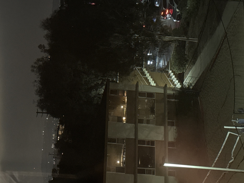 The image depicts a nighttime scene from an elevated vantage point at the University of California, Los Angeles (UCLA) campus in Los Angeles, California. In the lower-left foreground, a sand volleyball court is visible, marked by a white net and supporting poles. A prominent vertical light pole stands to the left of the court, casting some illumination. A dark, thin cable runs horizontally across the bottom of the frame. To the right and slightly behind the sand court, a multi-story building, consistent with dormitory architecture, occupies the left midground. Its exterior is light-colored, possibly beige, with darker horizontal bands separating the floors. Large windows are present on both visible floors, with interior lights active in several rooms, particularly on the upper level. An external, light-colored concrete staircase with railings descends from the building's right side, leading to a paved pathway. Beyond the pathway, dense trees and foliage are present, partially obscuring a parking lot. Multiple vehicles are parked, including at least one white SUV. One vehicle displays illuminated red taillights, and another shows a white light source. The pavement of the parking area appears wet, reflecting ambient artificial lights. The background shows scattered city lights across distant, dark hillsides, indicative of an urban or suburban environment. Electrical power lines and poles are faintly discernible against the dark sky. No individuals are visible, and no specific actions or interactions are depicted.