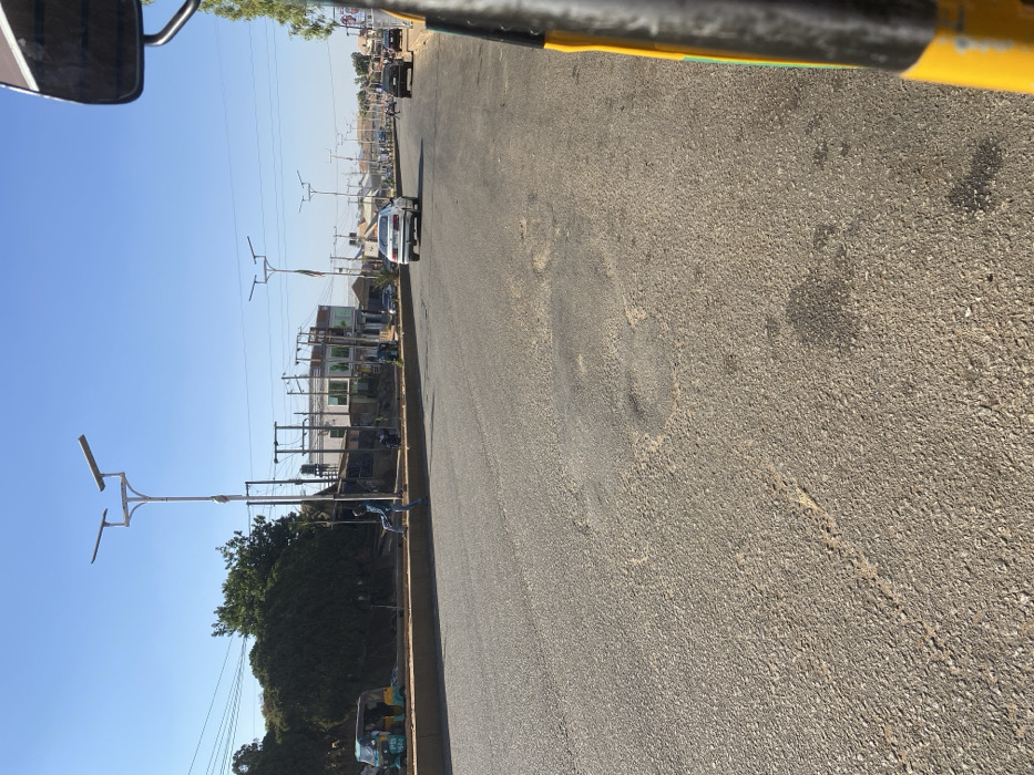 The image depicts a wide asphalt road in Bukuru, Nigeria, under a clear blue sky on a sunny day