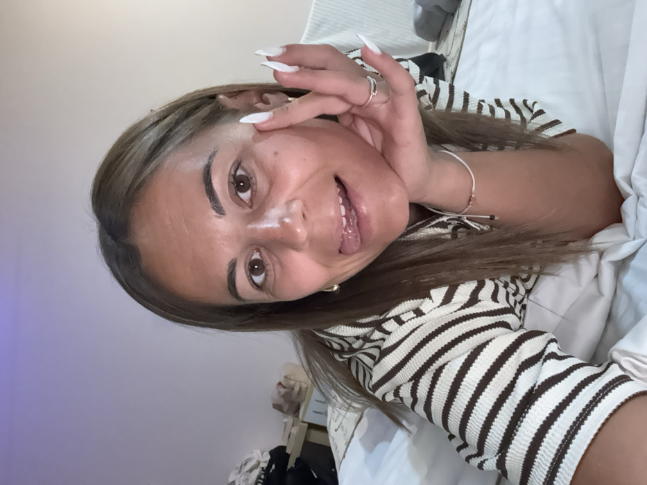A female subject with brown hair and brown eyes is depicted in a close-up indoor shot, likely a selfie, while lying on a bed in Maafushi, Maldives. She looks directly at the camera with a playful expression, her tongue slightly extended, licking her upper lip. A white substance is visible on the bridge of her nose. Her left hand, featuring long, pointed white fingernails and a ring on the ring finger, supports her chin. A delicate white bracelet with small beads is on her left wrist. She wears a brown and off-white striped long-sleeved top and gold hoop earrings. The background consists of a light-colored wall with a subtle purple glow in the upper left, indicating artificial lighting. A light-colored bedside table with folded items is partially visible to the left. The subject is on a bed covered with white sheets.