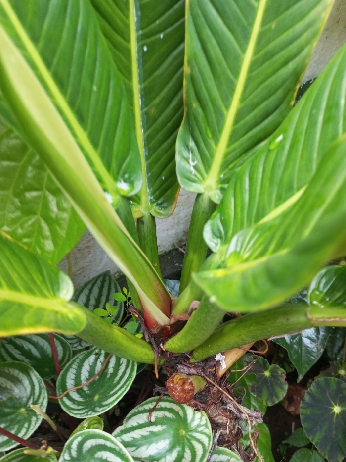 A vibrant green plant is captured from above, showcasing its lush foliage. Elongated leaves with prominent veins fan out from a central point. Water droplets glisten on the leaves, suggesting a recent watering. In the foreground, smaller, circular leaves with distinct striped patterns add contrasting texture and color. The plant's base reveals reddish stems amidst a network of roots and decaying matter. A few other plants with smaller, round leaves sit at the bottom right.